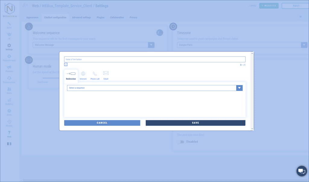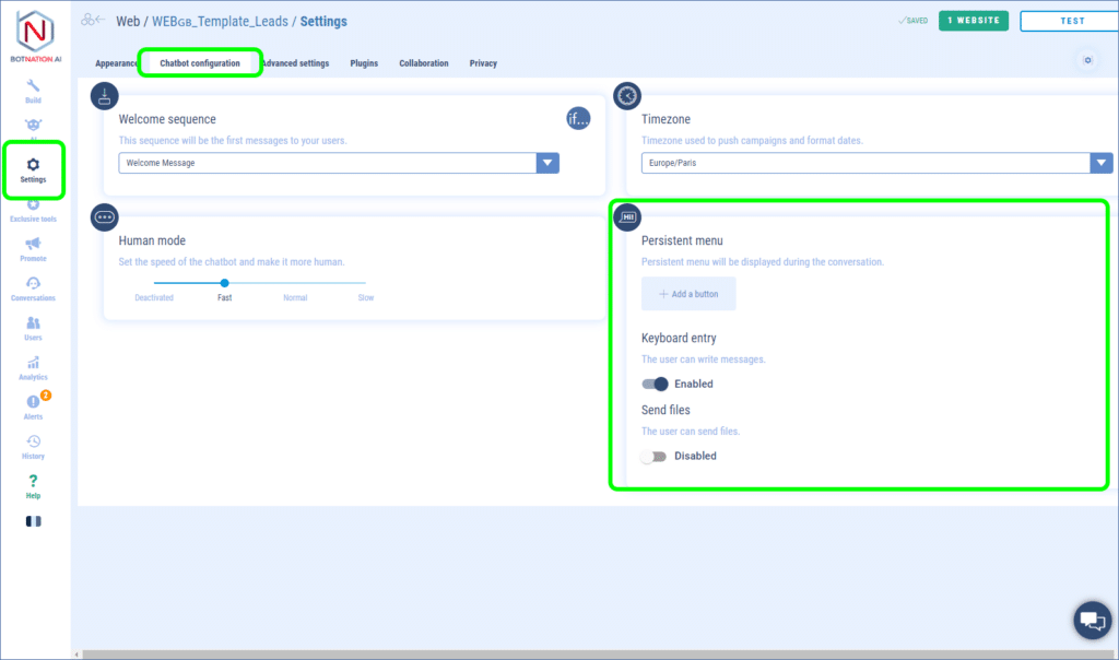 This menu is configured in the “Settings” of the chatbot in the tab “Chatbot configuration”.