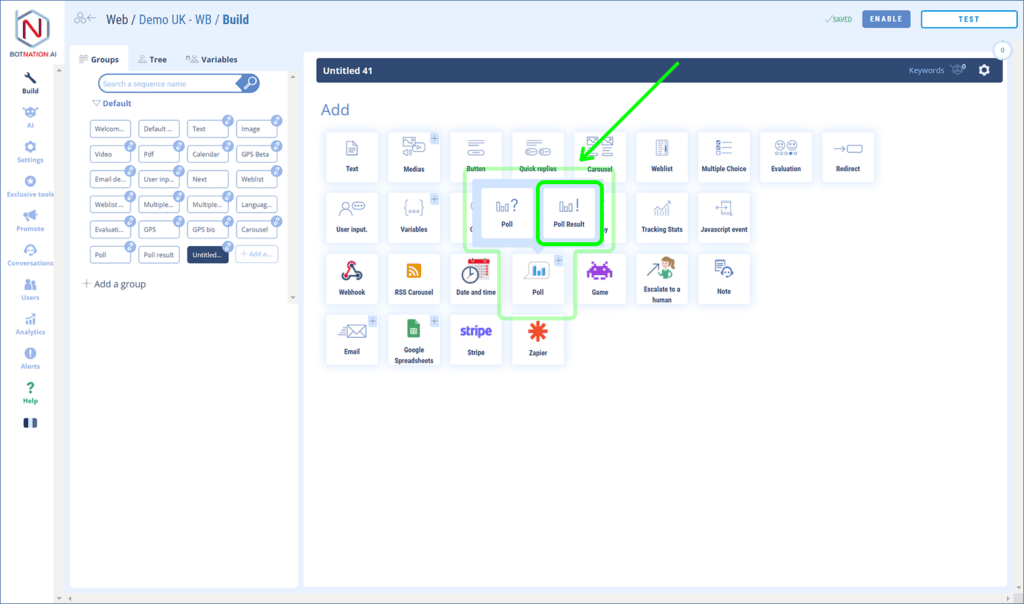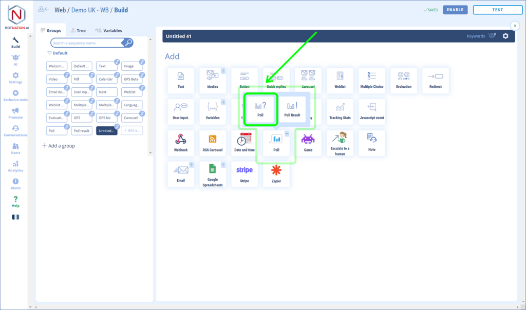 To add a poll to your chatbot you need to proceed in two steps: first you need to create the poll in the dedicated tool and then add it in a sequence.