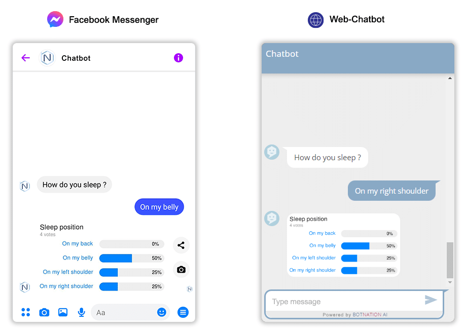 The poll when added to the chatbot will take the form of Quick Replies (see the following articles: Adding Quick Replies (Messenger) and Adding Quick Replies (Web Chatbot)).