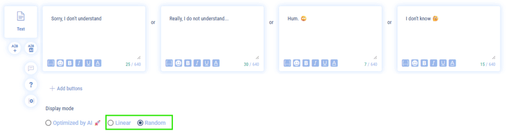 Some feature types will offer this mode. It lets you add several elements of the same type (text, image, video, etc.) in rotation. They will not be sent at the same time, but depending on the type of rotation (linear or random), the engine will choose one of the elements to send to your contact. It’s a great way to make your chatbot a little more human!