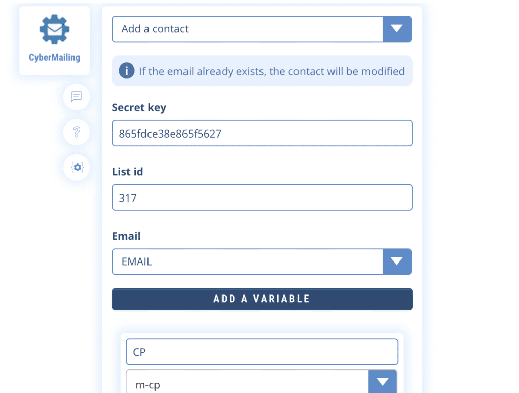 Cybermailing is the reference in terms of French-speaking autoresponders. You can very easily follow up your chatbot users by email using the Cybermailing connector on Botnation. In addition, a free account is available on Cybermailing for self-employed entrepreneurs and startups.