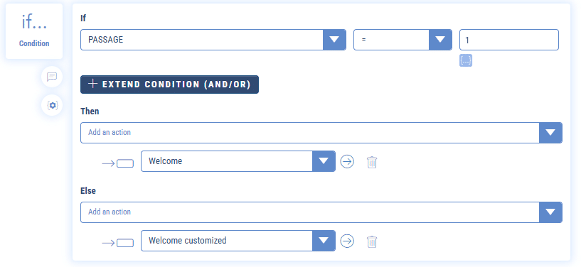At the beginning of the first welcome message, we will integrate a kind of toll that will count the users’ passages. If this is its first pass, then the sequence proceeds normally and its variable {{PASSAGE}} takes a point (+1). During its second passage, it will be assigned a second point, the variable {{PASSAGE}} will then be equal to 2. If the variable is strictly greater than 1, then we will send the second welcome message personalized with the user’s first name.