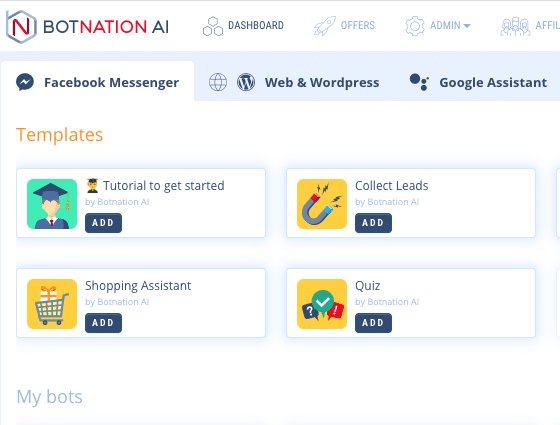 You have noticed that your Botnation space has several tabs corresponding to the platforms on which your chatbots are present. For our purposes, we will focus on the Facebook and Web & WordPress tabs: