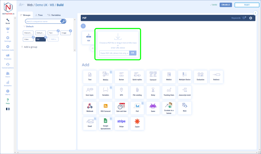 Just as it is possible to add an image or a video in a sequence of your chatbot, you can also add a PDF file to, for example, propose the download in PDF format of a price list, a product instruction manual, a contract, general conditions etc…