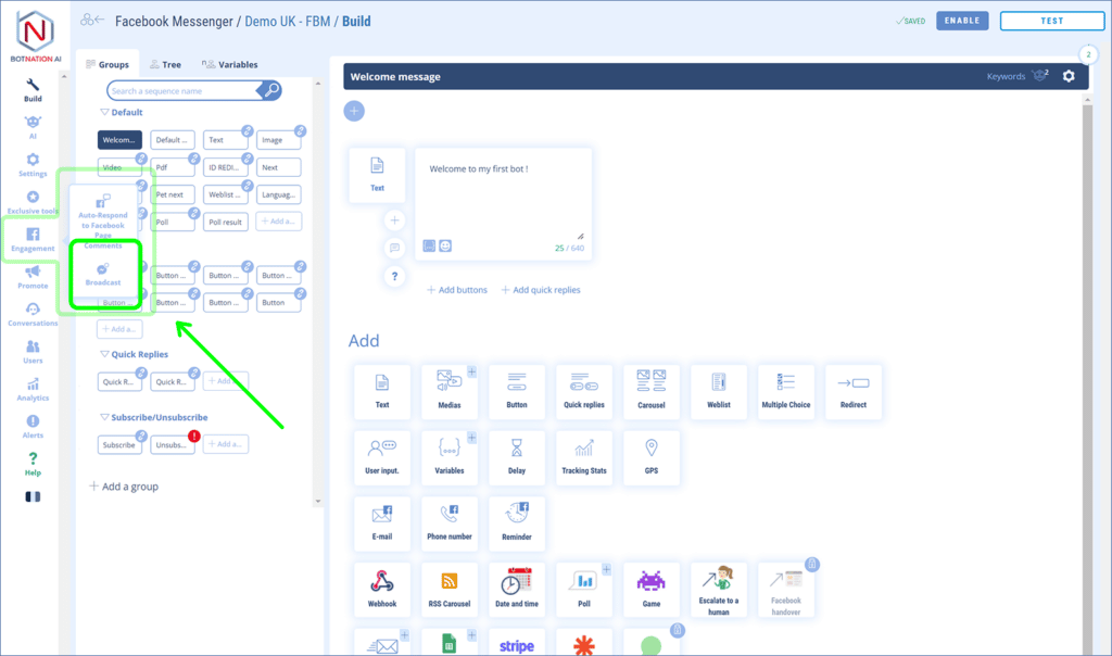 Click on the “Engagement” tab in the main navigation on the left of your chatbot to access the BROADCAST tab. Please note: This feature is only available for chatbots for Facebook Messenger.