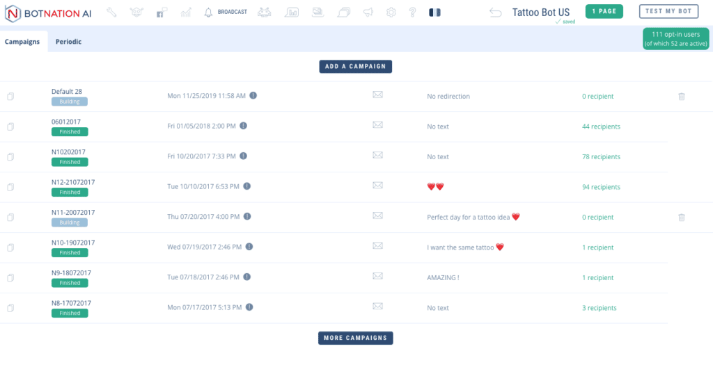 Thanks to the new version of Botnation’s “Push notifications” module you can send a message to groups of users on Facebook Messenger according to the filters you have set up. Of course, you can only target people who have used certain sections of your chatbot, through variables. In addition, you can schedule your notifications and re-launch them at the desired days and times.