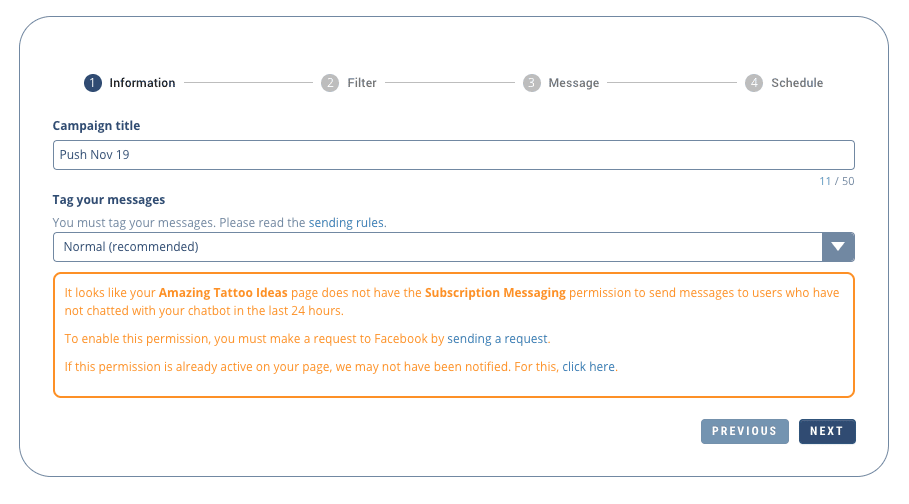 First of all: Remember that your users must have previously agreed to receive notifications via an opt-in action in your chatbot