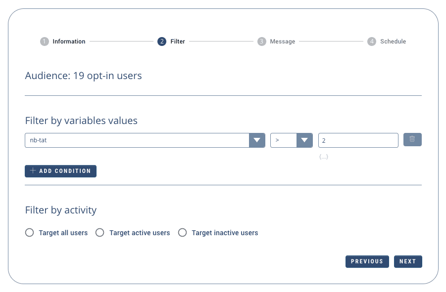 In the example below, we filter by sending the campaign only to users whose associated variable nb-tat is greater than 2.