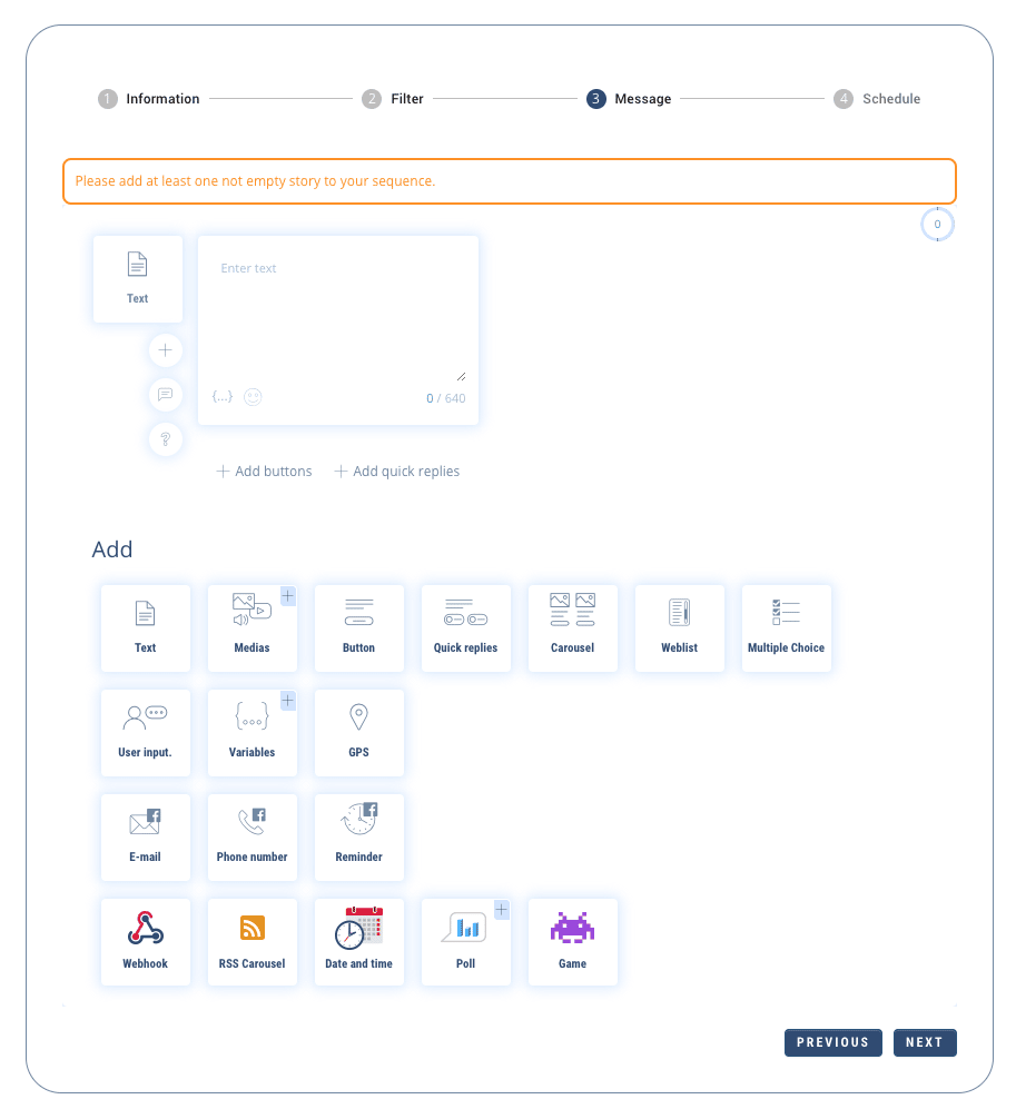 To create your sequence, you have access to most of the usual functionalities (texts, images, buttons, etc.) of the Botnation chatbot creation platform.
