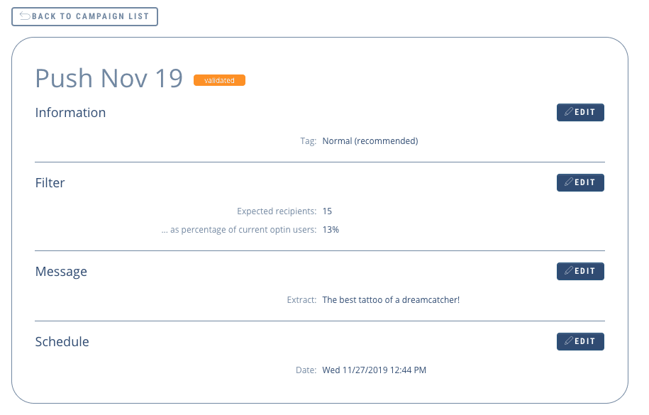 • Clicking on a campaign will take you to a summary. And if the campaign is not finished, you can edit it.