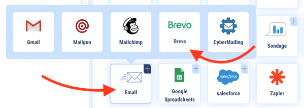 Let’s move on to Botnation. The Brevo connector can be found in the “Email” drawer of your Botnation chatbot functions, at the bottom of each sequence on your Botnation interface.