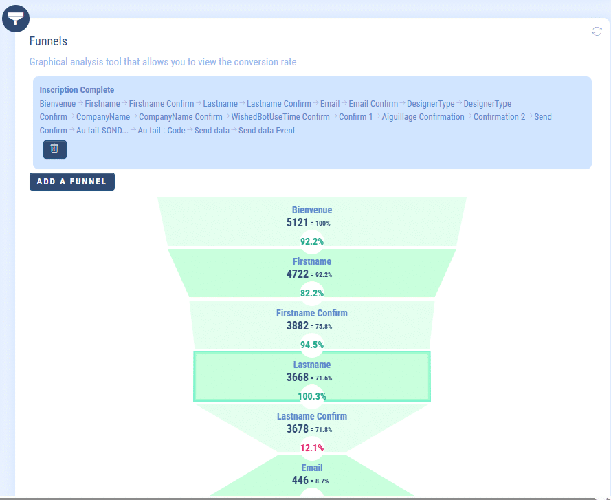 In the screenshot above, “Bienvenue” = 5,121 users, which represents 100% since it’s the first step.