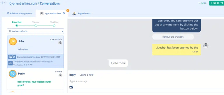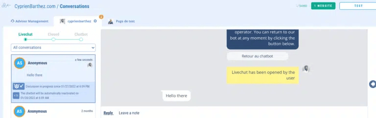 You can also see that the first green dot “Livechat” displays the live chat conversations. The second one, “Closed”, will show you the closed conversations and the third one, “Chatbot”, will show you the automated chats of the chatbot allowing access to the history.