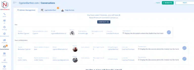 Once you have invited your collaborators to participate in the chatbot by sharing the rights, you will see them appear in the second block “Your collaborators”.