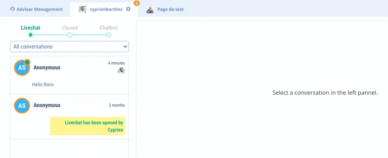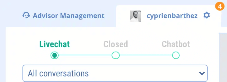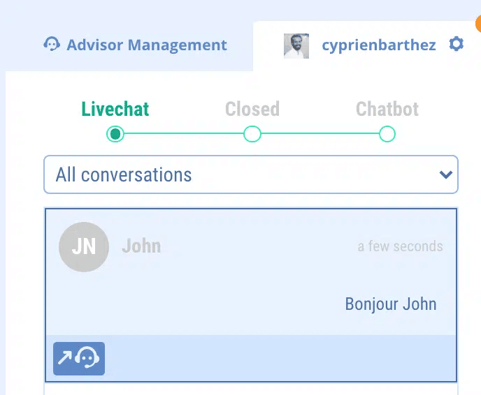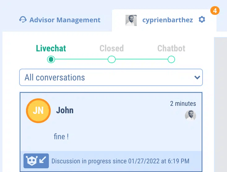As a general rule, when an advisor takes a conversation, it is automatically assigned to them. Then, each advisor can find his or her current discussions via the drop-down menu provided for this purpose. He can also find those of his collaborators.
