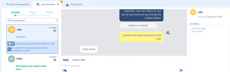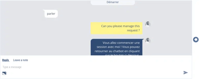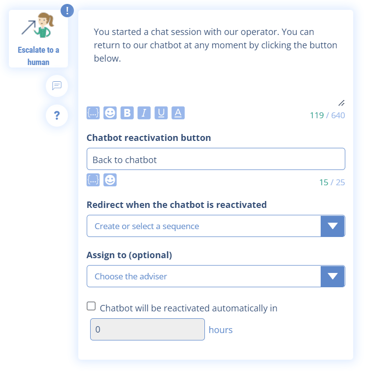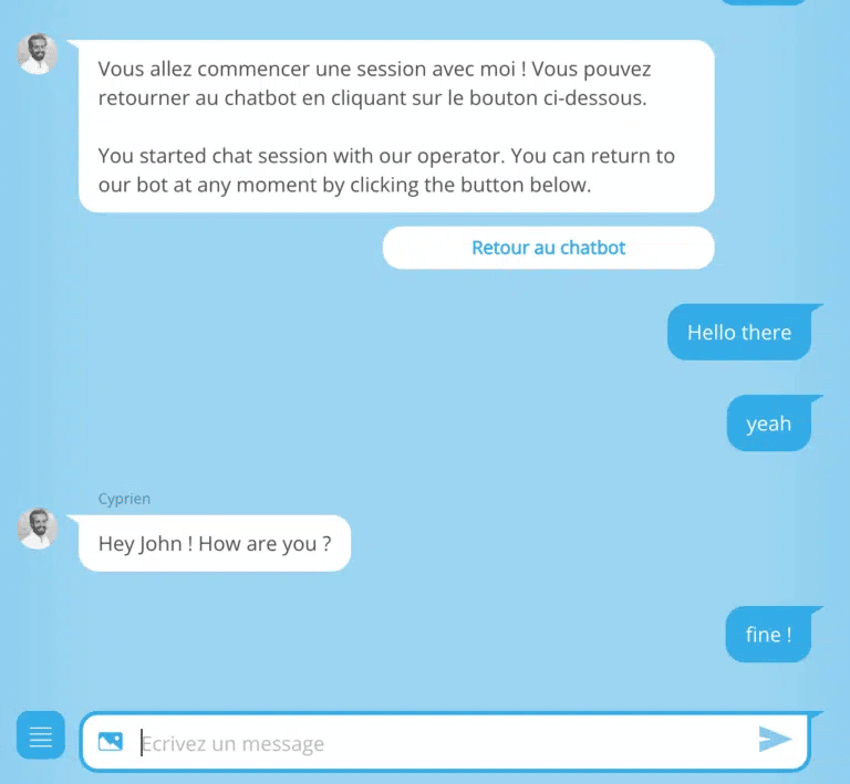 When the user wants to return to the chatbot, he will click on the button provided for this purpose (which you have previously configured in the escalation to the human). For example, this is the “Back to chatbot” button. Then, the chatbot’s sequences will unfold as you have programmed them.