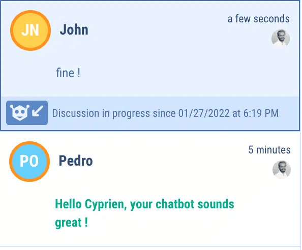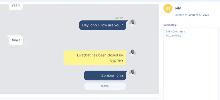 When configuring the chatbot, we advise you to ask for the user’s first name in the first sequences and to capture this information in a variable of type {{PRENOM}} or {{SOCIETE}}. This will allow you to display the first name of your contact person or the company name, which is a significant advantage when you manage several tickets.
