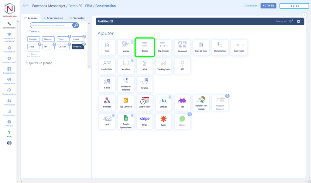 La première consiste à ajouter directement cette fonctionnalité en cliquant sur l’icône « bouton » qui se trouve parmi les autres fonctionnalités. (Voir ci-dessous).