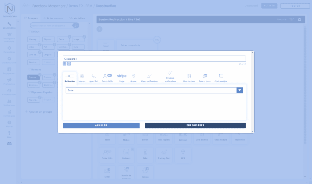 Puis, vous aurez la possibilité de choisir le type d’action que le chatbot effectuera quand l’utilisateur clique le bouton.