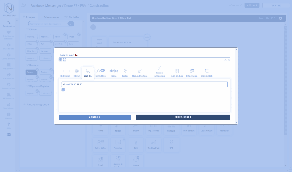 La fonctionnalité Bouton est toujours constituée d’un texte (limité à 640 charactères) et d’un maximum de trois boutons.
