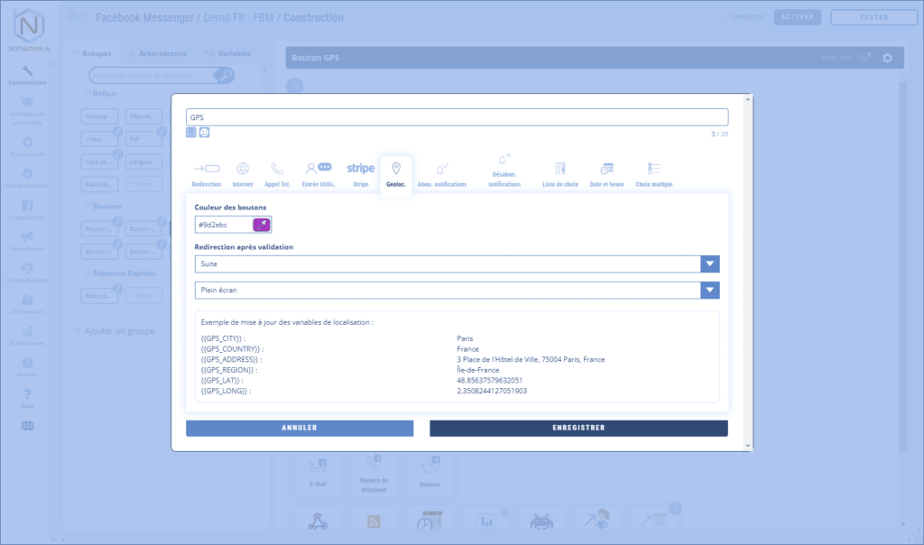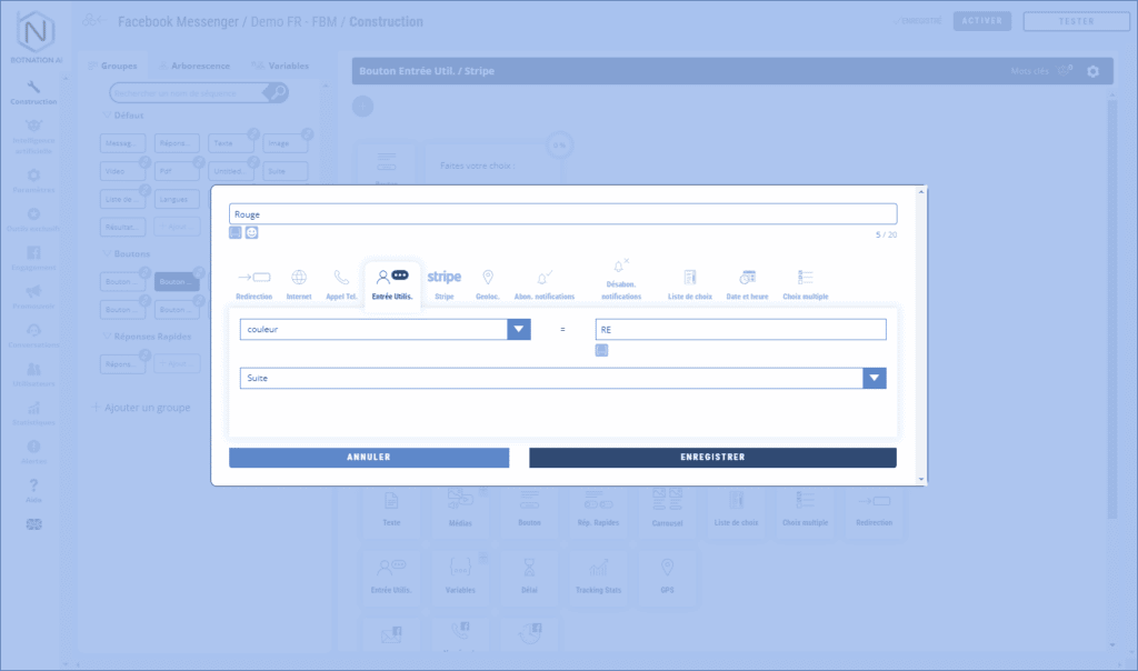 Cette action permet au chatbot d’enregistrer une valeur pour une variable donnée lorsque l’utilisateur clique le bouton.