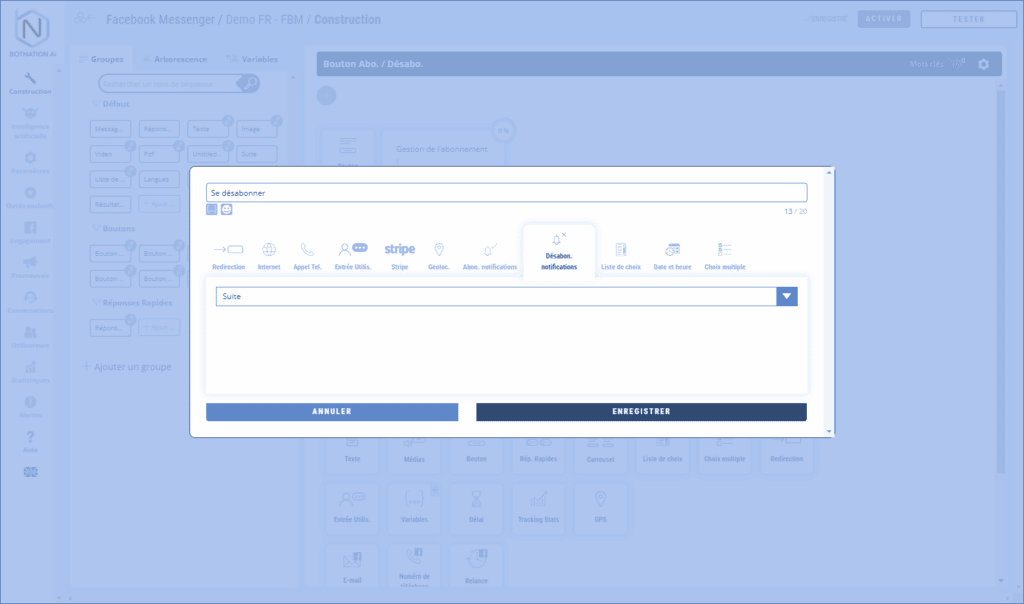 En cliquant sur ce bouton, l’utilisateur se désabonne des notifications du chatbot.
