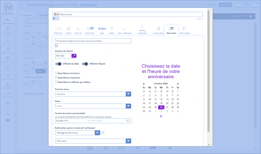 Au clic du bouton, une fenêtre popup s’ouvrira et affichera un calendrier et/ou une horloge qui permettront à l’utilisateur de choisir une date et/ou un horaire.