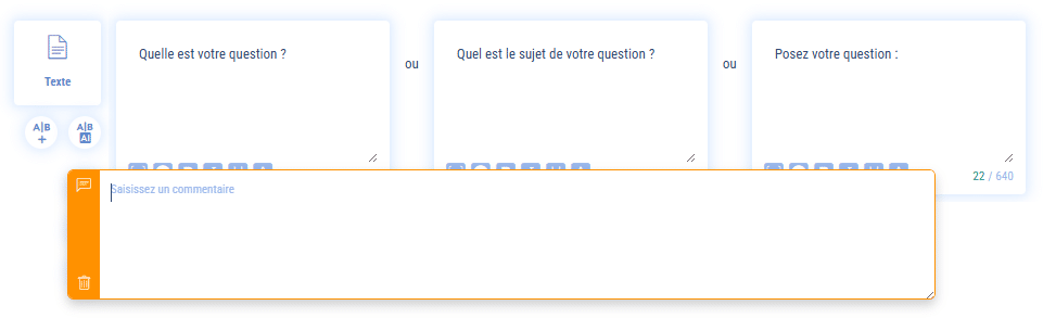 Pour ajouter, lire ou éditer un commentaire il vous suffit de cliquer sur la petite bulle de texte se trouvant à la gauche de chaque élément de votre chatbot.