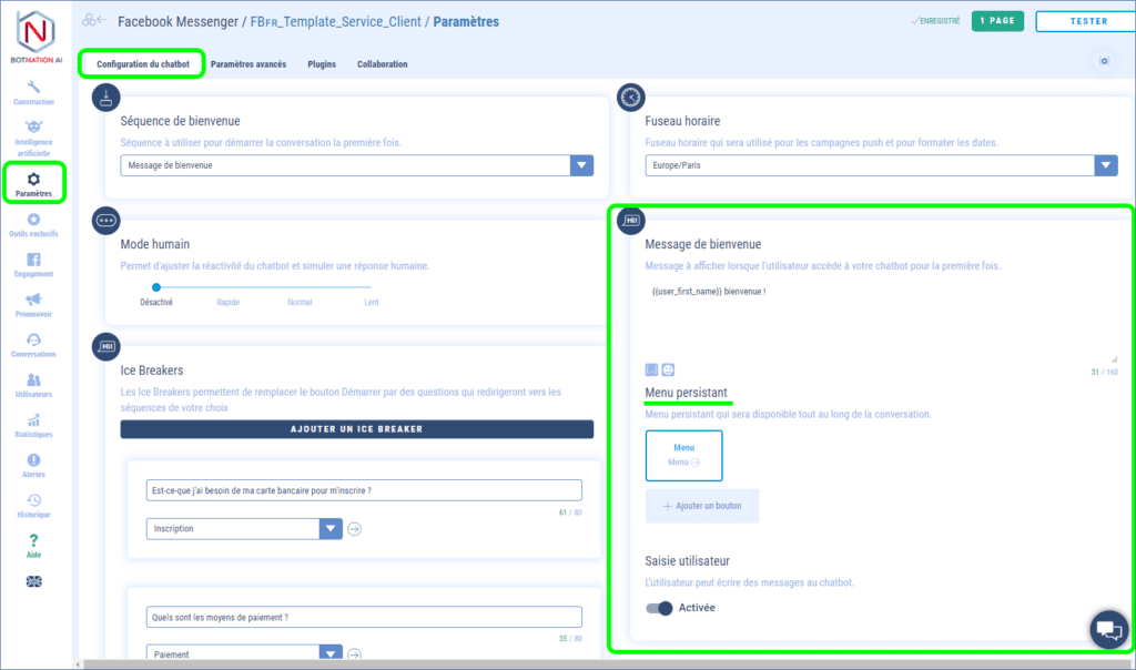 Ce menu se configure dans les « Paramètres » du chatbot dans l’onglet « Configuration du chatbot ».