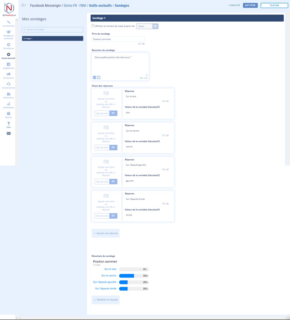 Le sondage a les mêmes limitations que les Réponses Rapides, vous ne pouvez donc proposer qu’un maximum de 11 réponses possibles.