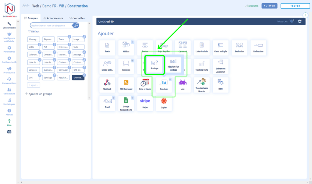 Pour ajouter un sondage à votre chatbot il faut procéder en deux étapes : il faut tout d’abords créer le sondage dans l’outil dédié puis l’ajouter dans une séquence.