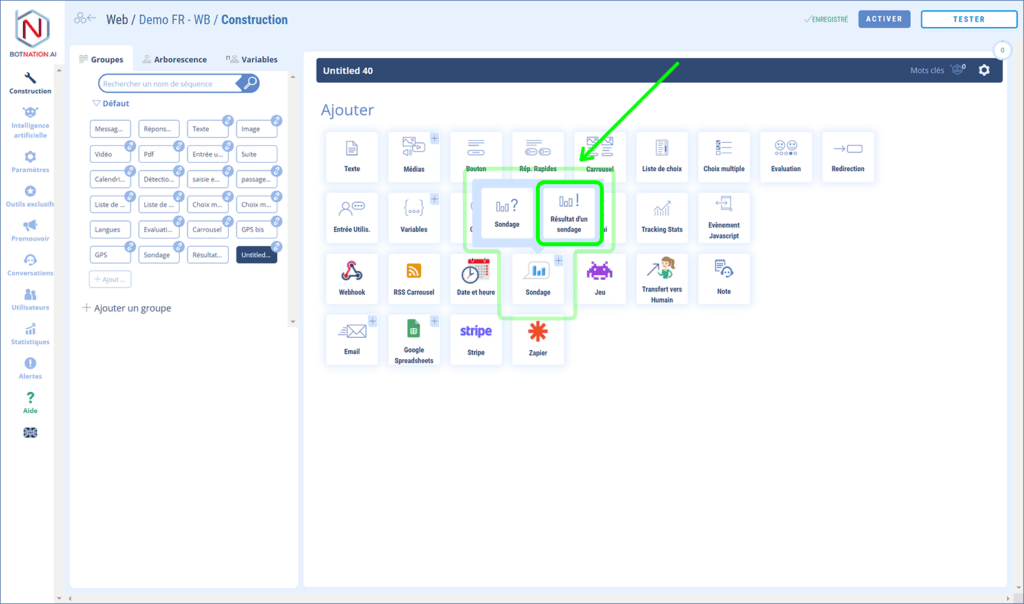 Choisissez la séquence dans laquelle vous voulez ajouter le sondage puis, parmi les fonctionnalités de construction, cliquez sur « Sondage » puis, dans le menu qui s’ouvre, cliquez sur « Résultat d’un sondage».