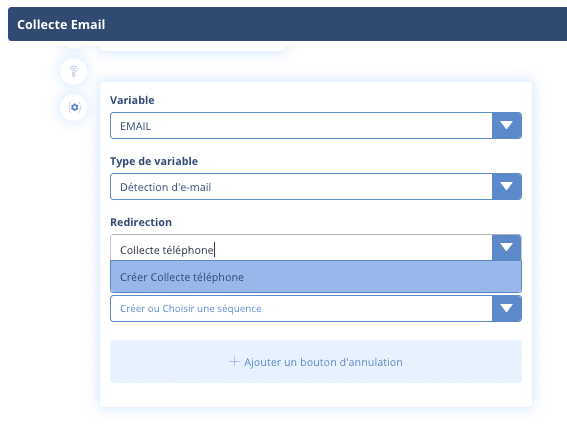 Ensuite, le module vous demande où vous souhaitez que l’utilisateur soit redirigé en suivant. Créons donc une séquence « Collecte téléphone » :