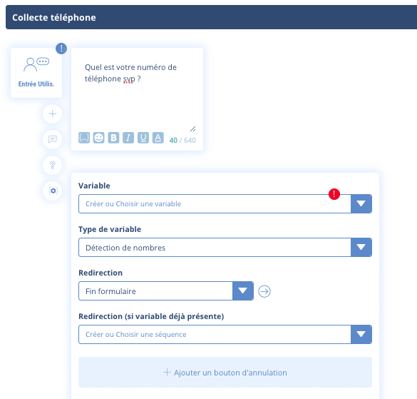 - Détection de nombres : le chatbot ne retiendra que les nombres, ce qui est très utile pour un numéro de téléphone par exemple.
