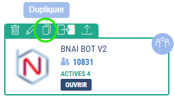 Pour copier votre chatbot sur Botnation il vous suffit de cliquer sur l’icône « Dupliquer » se trouvant au dessus de l’intitulé de votre chatbot sur l’écran principal de vos projets.