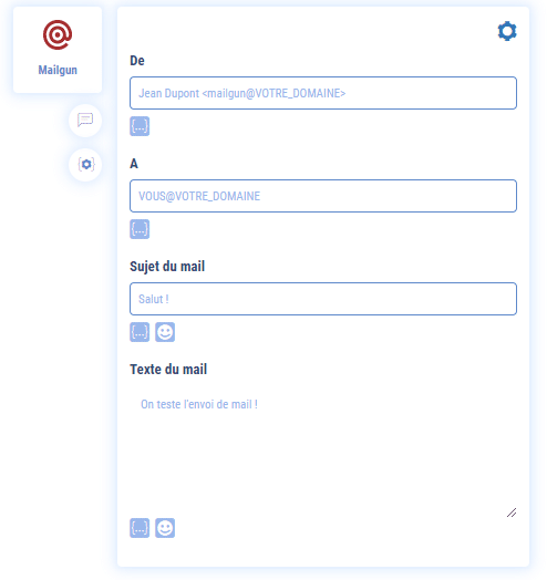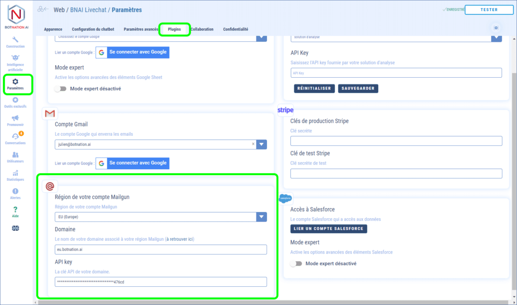 Pour associer votre compte Mailgun à votre bot vous devez renseigner 3 paramètres :