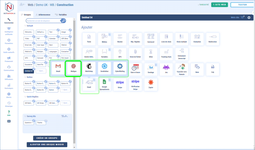 Parmi les fonctionnalités de construction, cliquez sur « Email » puis, dans le menu qui s’ouvre, cliquez sur « Mailgun ».