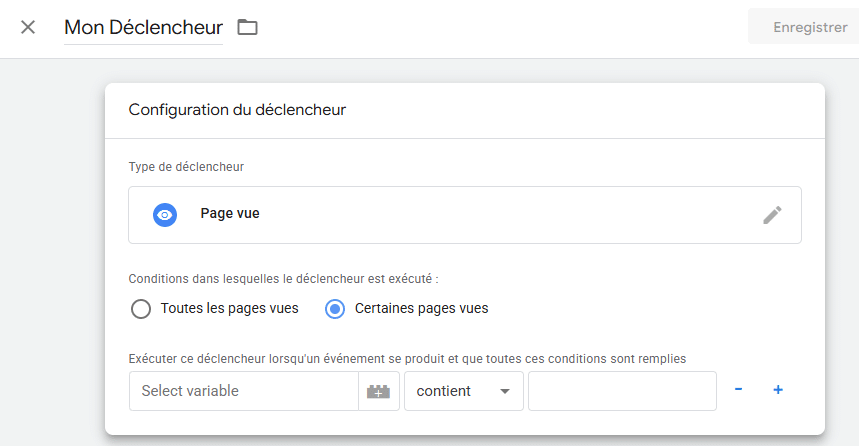 Il va maintenant falloir dire à Google Tag Manager à quel moment afficher le Chatbot, c’est le rôle du déclencheur.