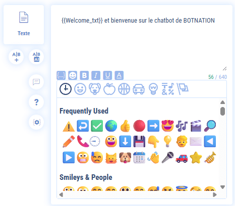 Un clavier regroupant les principaux emojis est désormais disponible directement dans l’édition de votre chatbot sur Botnation.