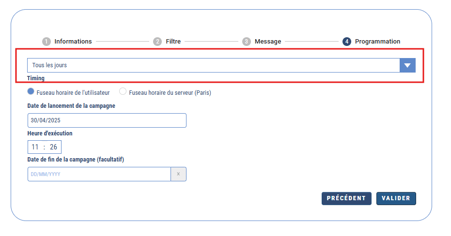 L’écran de programmation ressemble beaucoup à celui d’une notification simple mis à part qu’ici, vous pouvez choisir la fréquence d’envoi grâce à la liste déroulante entourée en rouge.