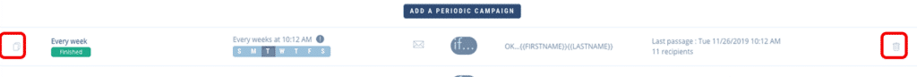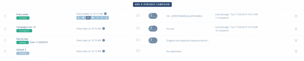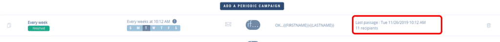 Dans cette liste, vous pouvez voir la date du dernier passage et son nombre de destinataires associés.