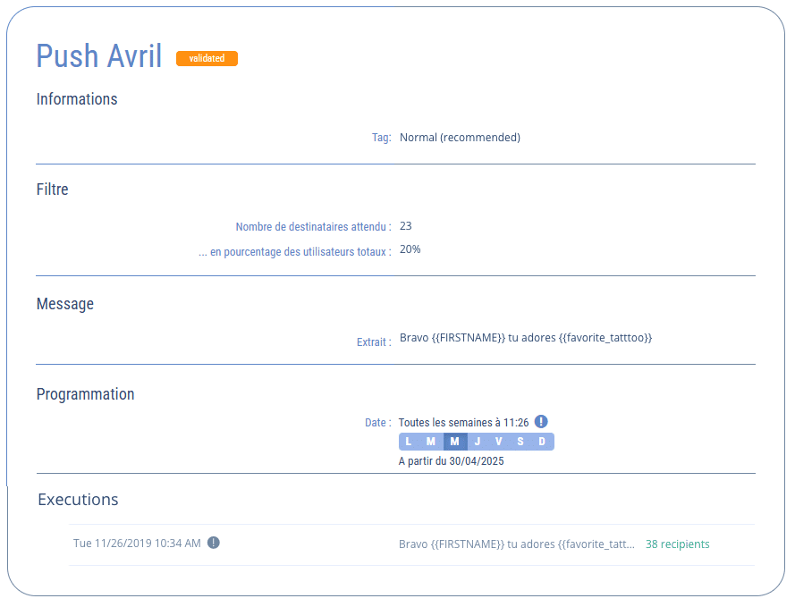 - en cours : la notification est programmée, la date de lancement est passée mais pas encore la date de fin.