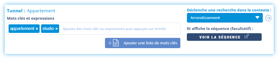 On crée un premier Tunnel “Appartement” avec les mots clés correspondants et qui lancera une recherche dans le Contexte “Arrondissement”.