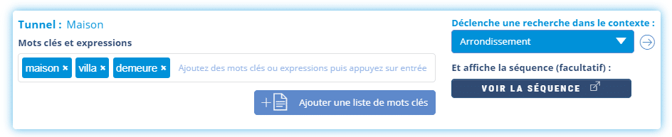 On crée ensuite un Tunnel “Maison” avec les mots clés correspondants et qui lancera lui aussi une recherche dans le Contexte “Arrondissement”.