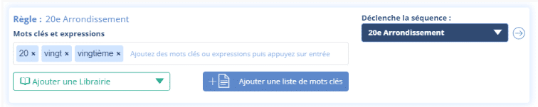 Dans ce contexte-ci on crée de simples règles d’IA pour détecter chaque arrondissement qui chacune renverra à des séquences dans lesquelles on stockera la valeur de l’arrondissement (un nombre entre 1 et 20 puisque Paris compte 20 arrondissements) dans la variable “arrondissement”.