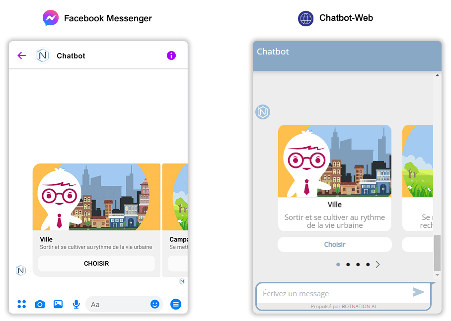 Le carrousel contient des images, un titre, un sous titre et 3 boutons d’action (voir les articles Ajouter des boutons (Messenger) et Ajouter des boutons (Chatbot Web)). Vos utilisateurs peuvent faire défiler les fiches carrousel en les faisant glisser sur leur mobile, tablette ou en cliquant sur les flèches de leur ordinateur < >.